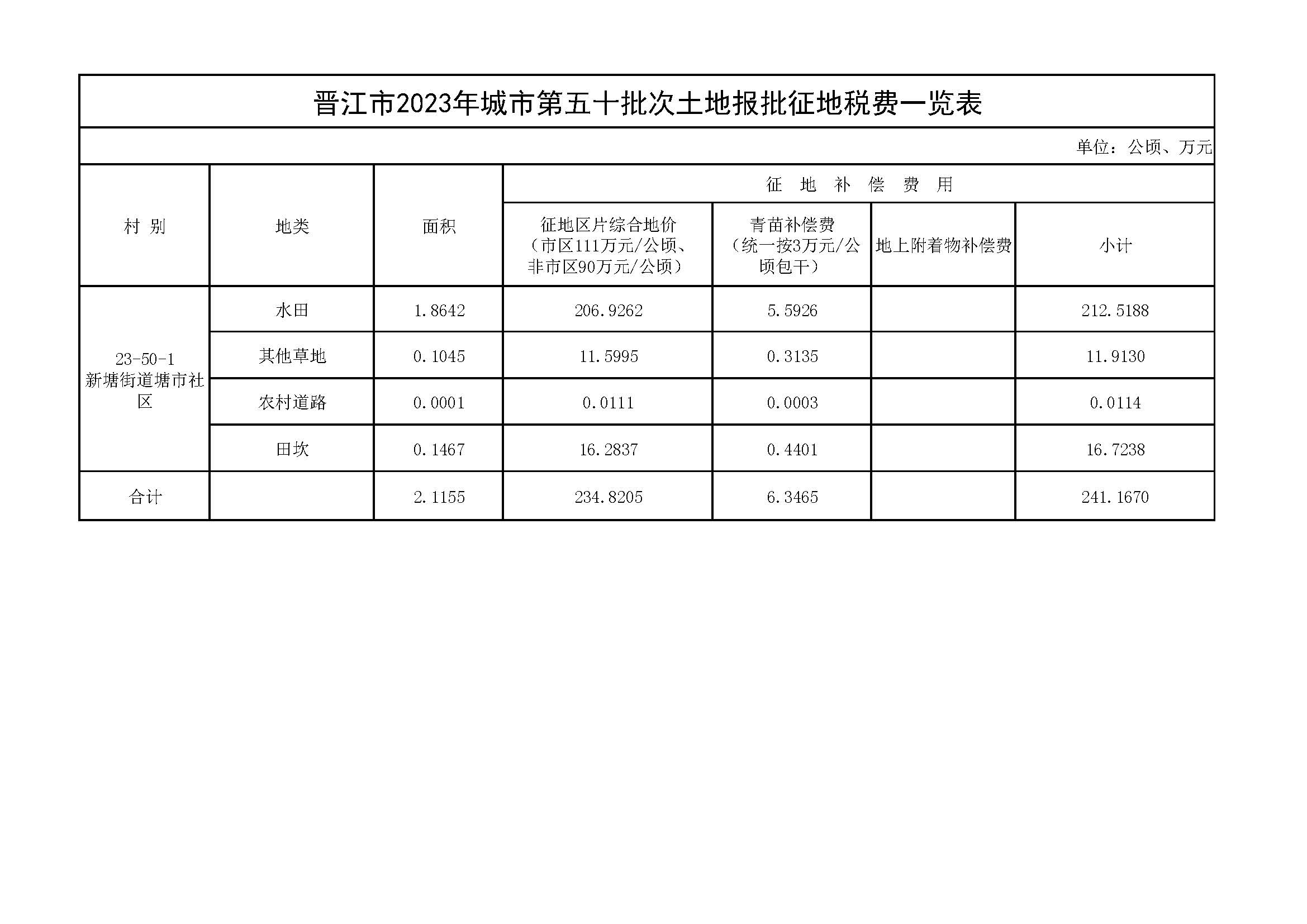 晋江市2023年城市第五十批次土地报批征地税费一览表