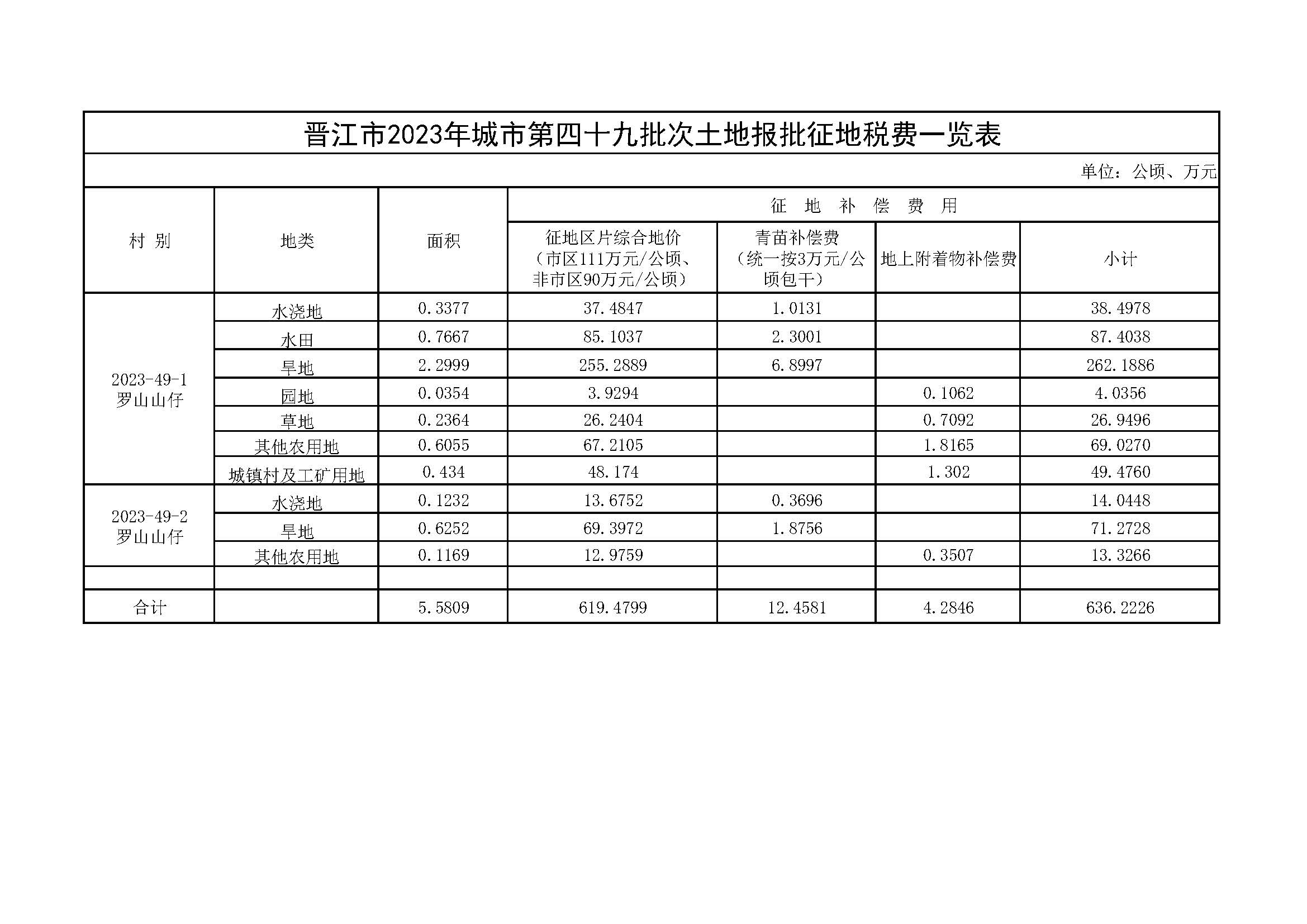 晋江市2023年城市第四十九批次土地报批征地税费一览表
