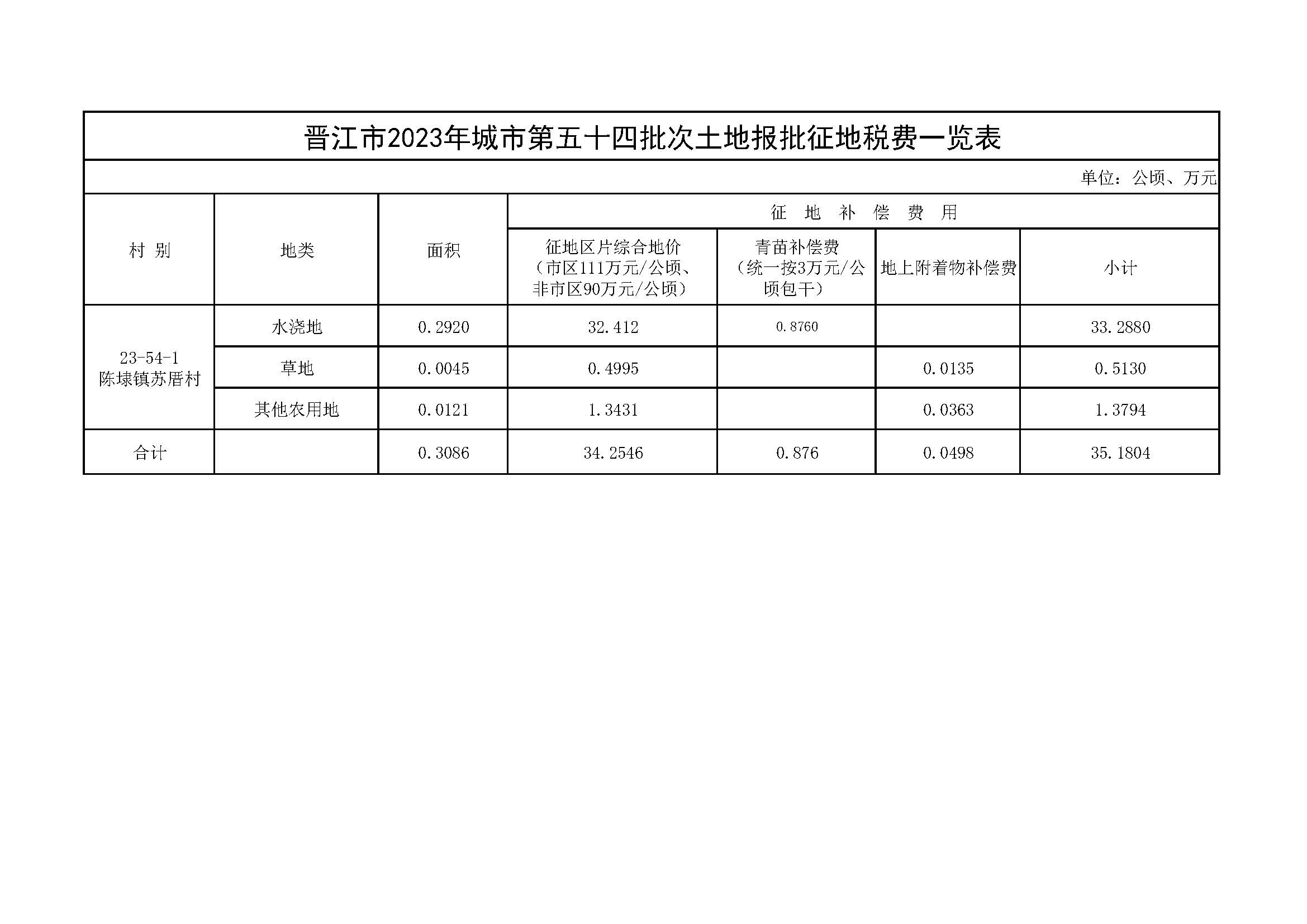 晋江市2023年城市第五十四批次土地报批征地税费一览表