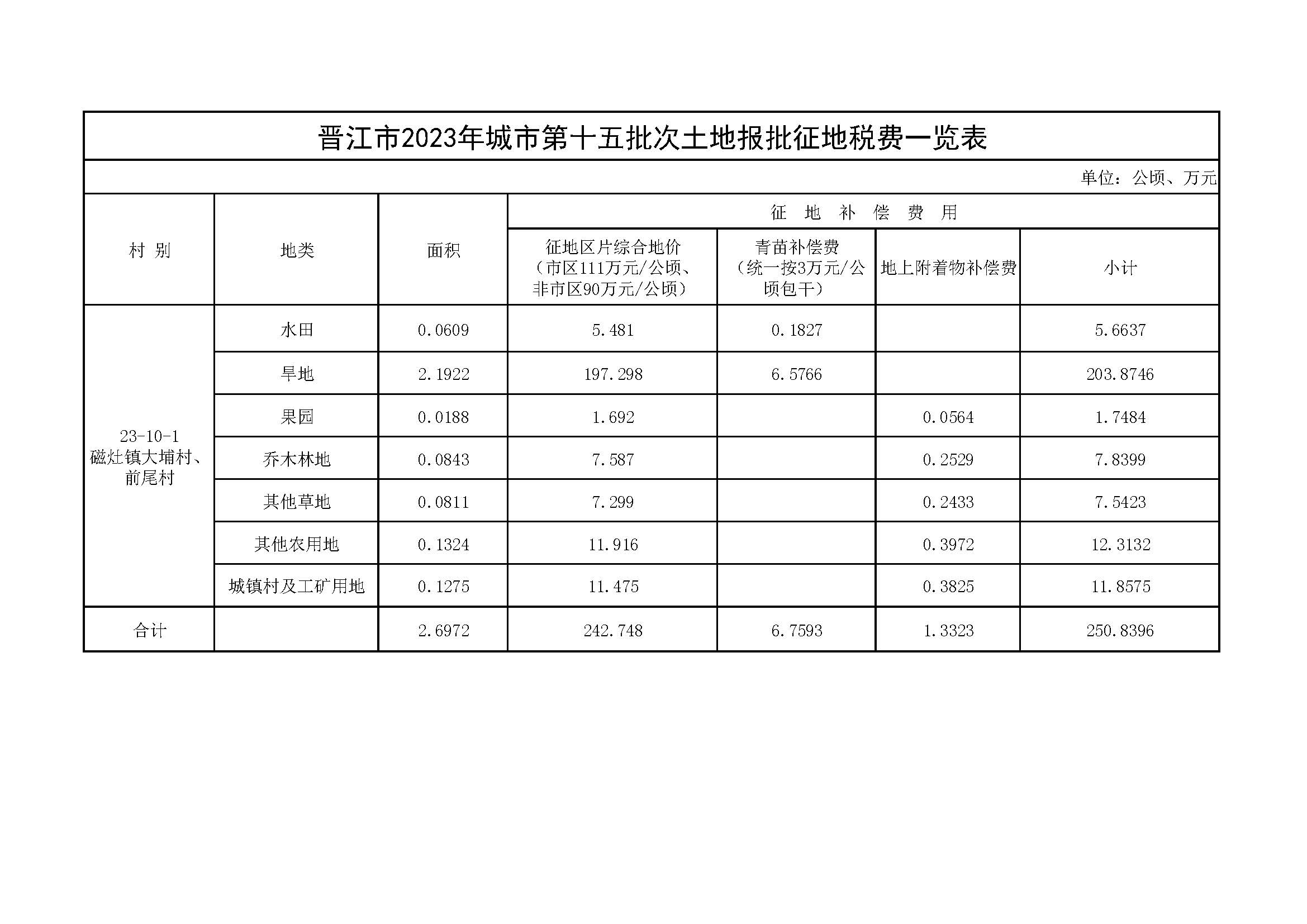 晋江市2023年城市第十五批次土地报批征地税费一览表