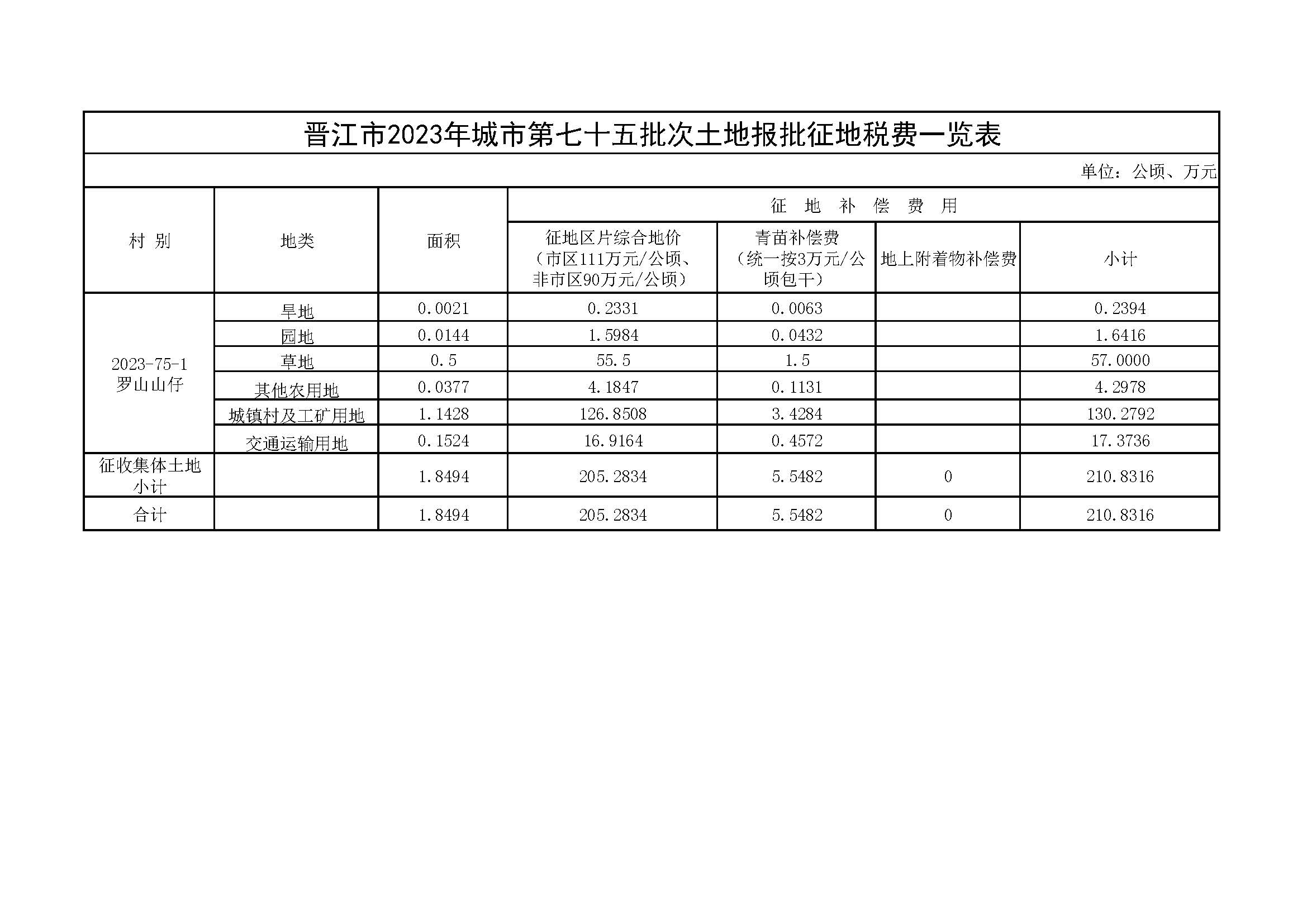 晋江市2023年城市第七十五批次土地报批征地税费一览表