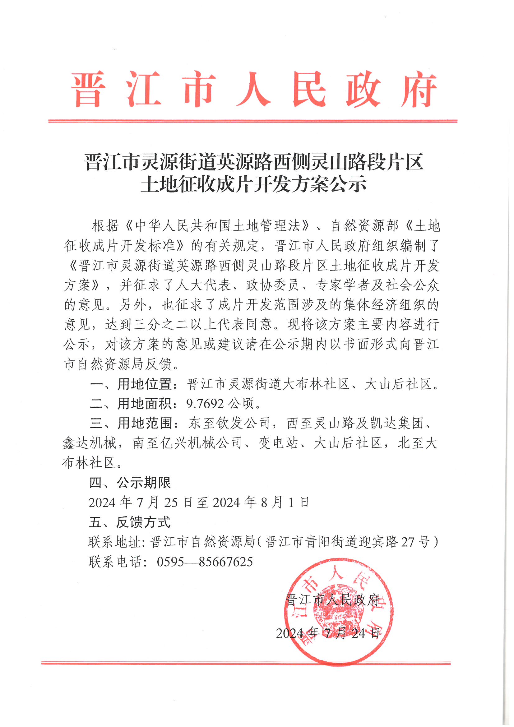 晋江市灵源街道英源路西侧灵山路段片区土地征收成片开发方案公示