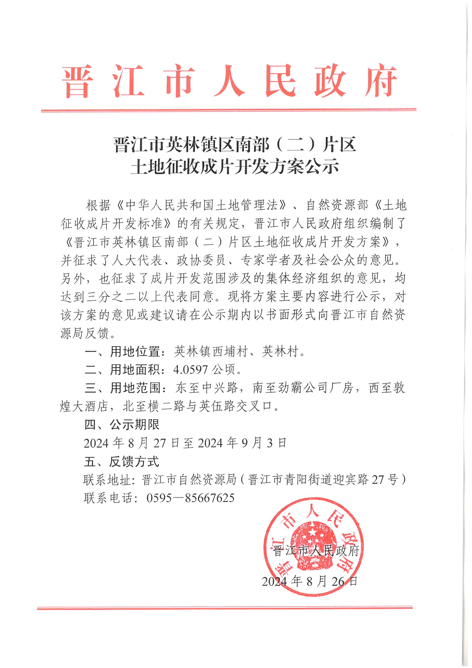 晋江市英林镇区南部(二)片区土地征收成片开发方案公示