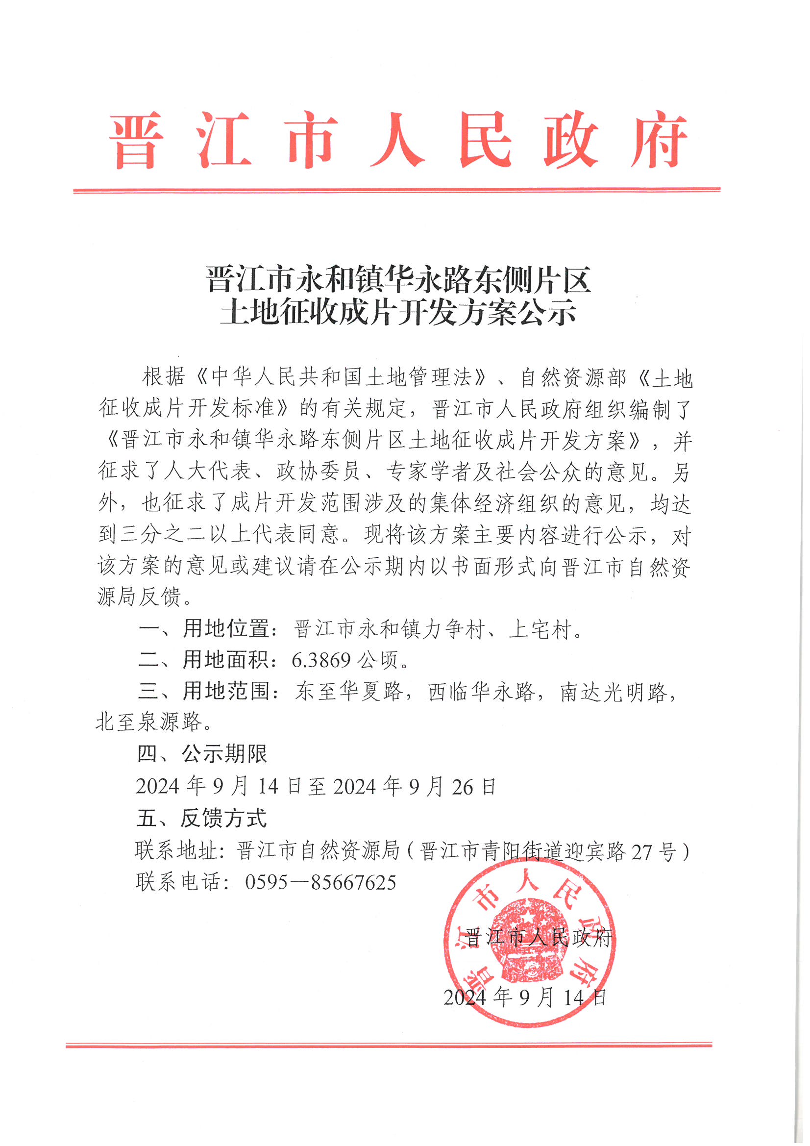 晋江市永和镇华永路东侧片区土地征收成片开发方案公示