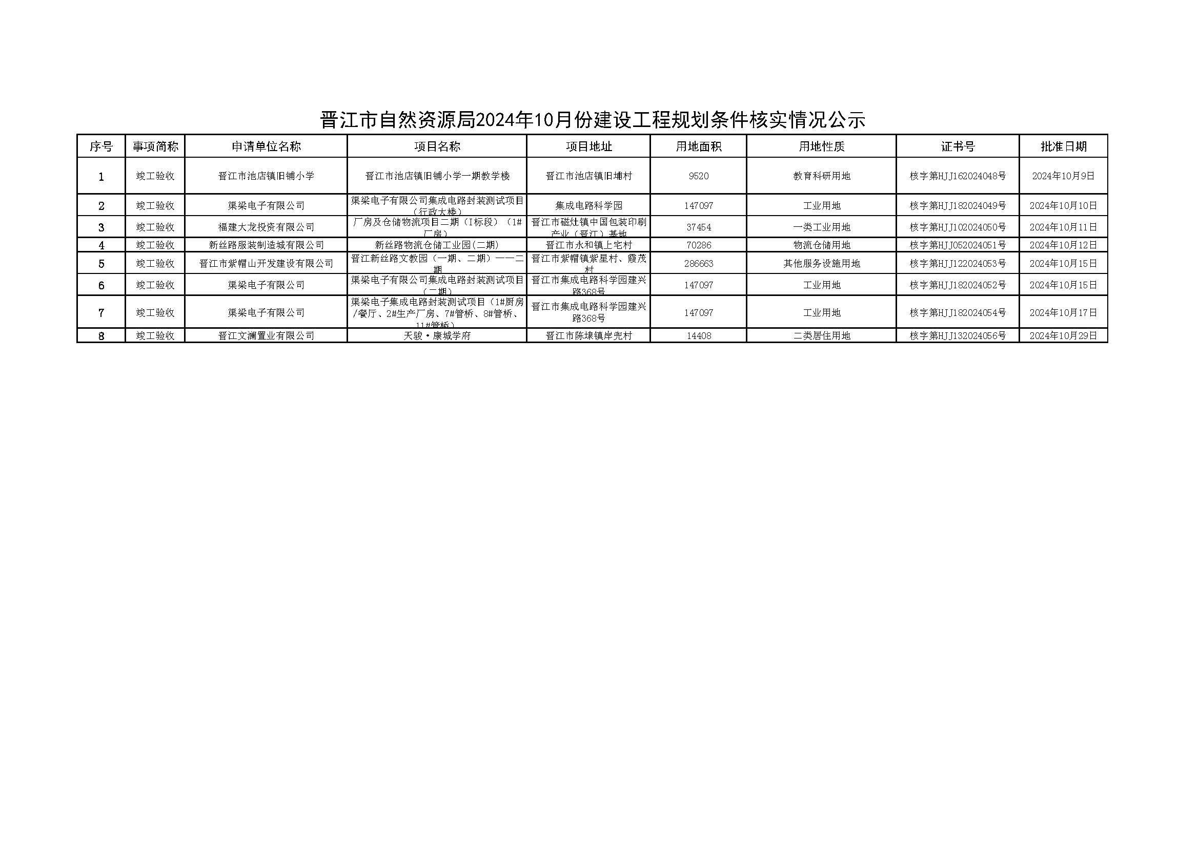 晋江市自然资源局2024年10月份划拨供地情况登记表