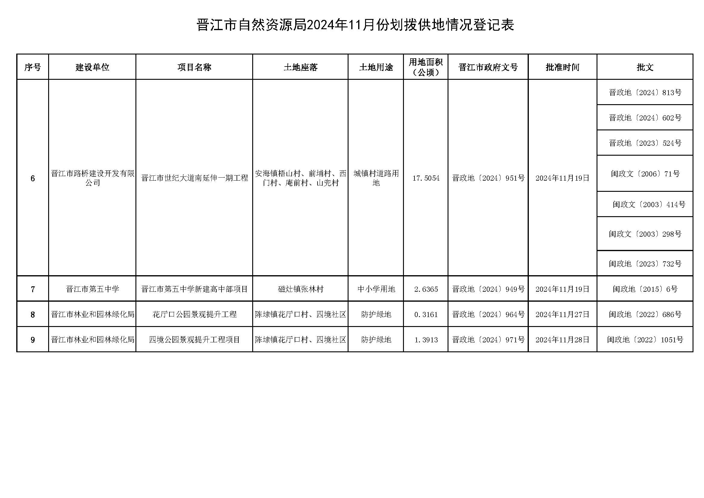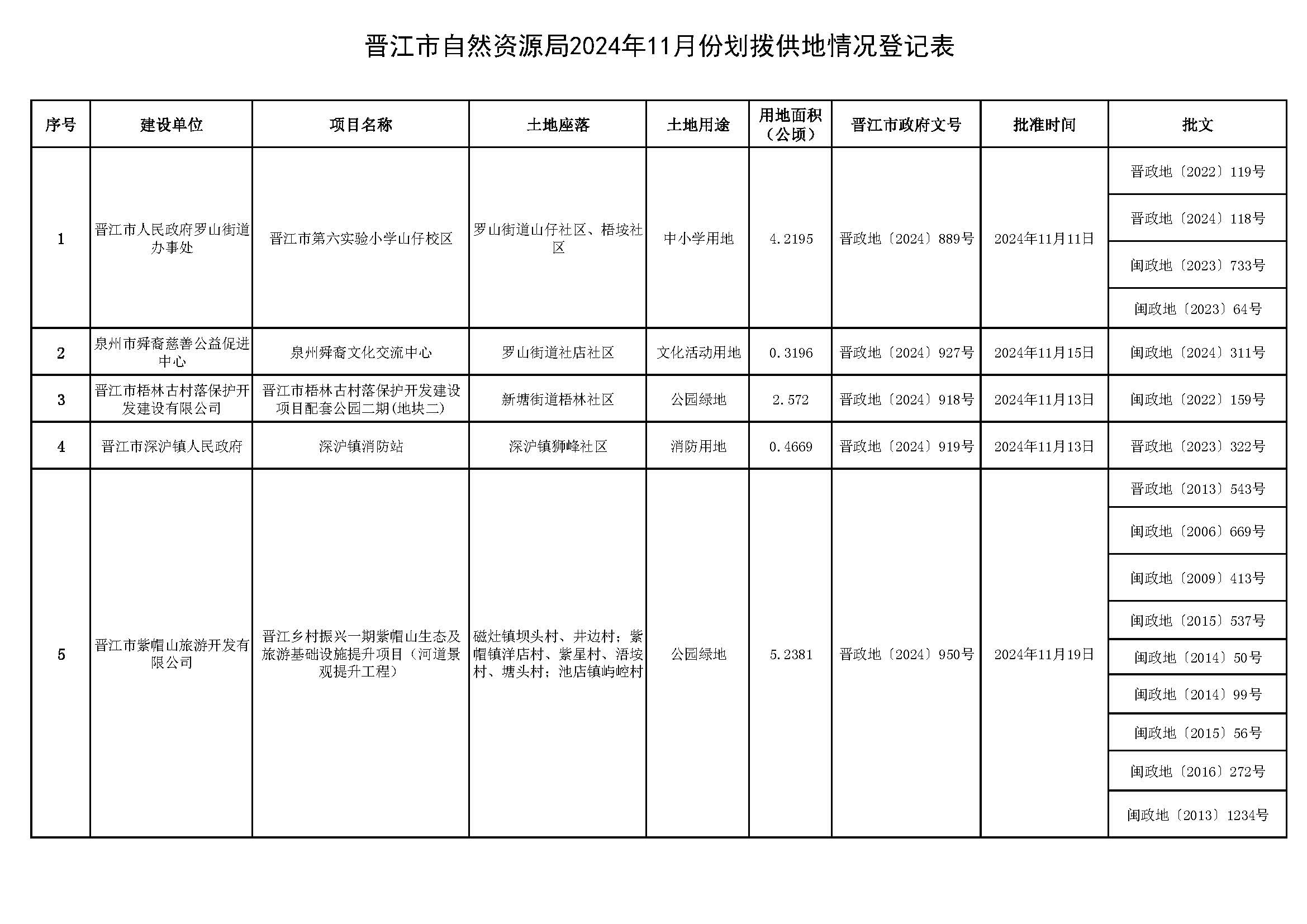 晋江市自然资源局2024年11月份划拨供地情况登记表