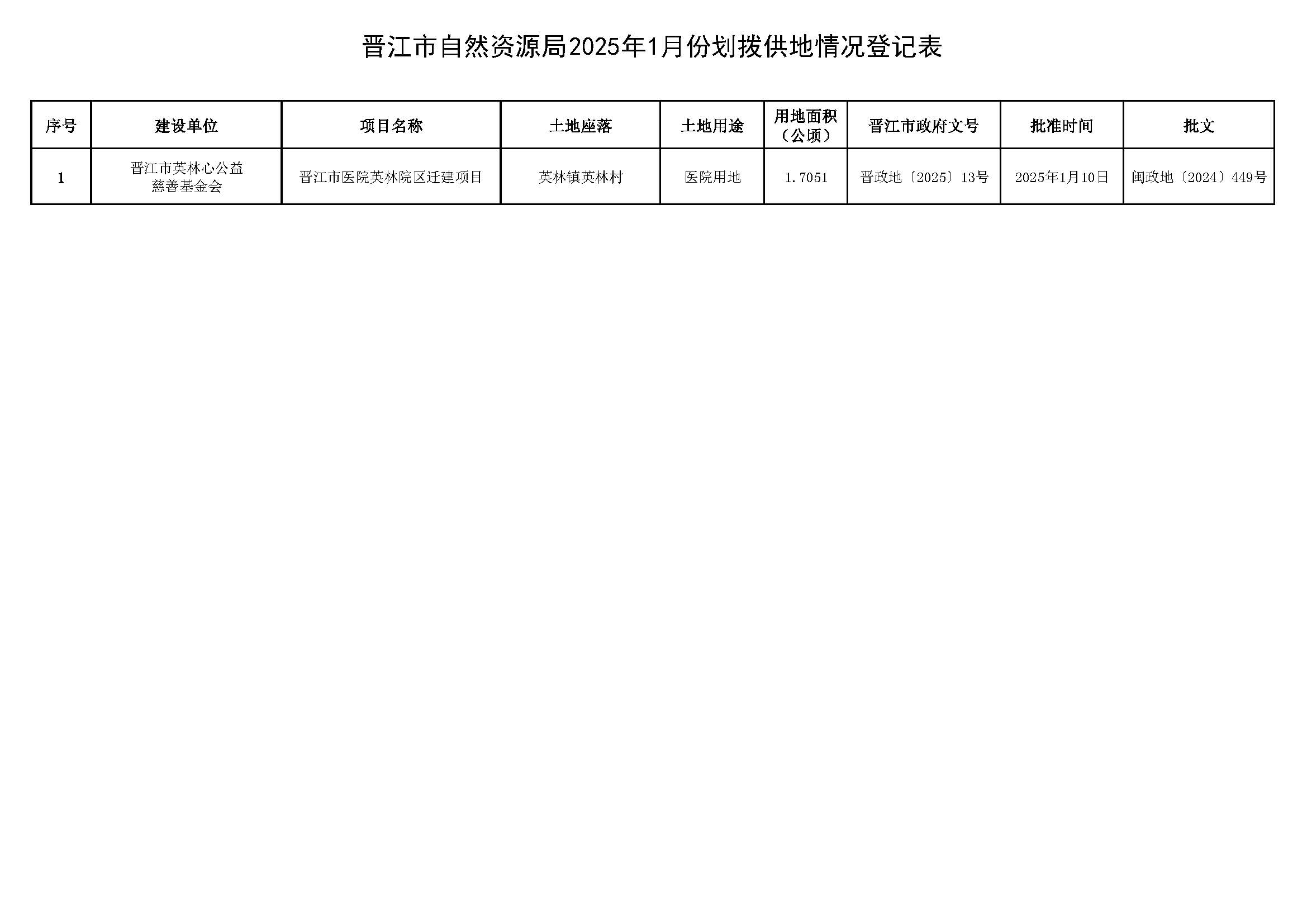 晋江市自然资源局2025年1月份划拨供地情况登记表