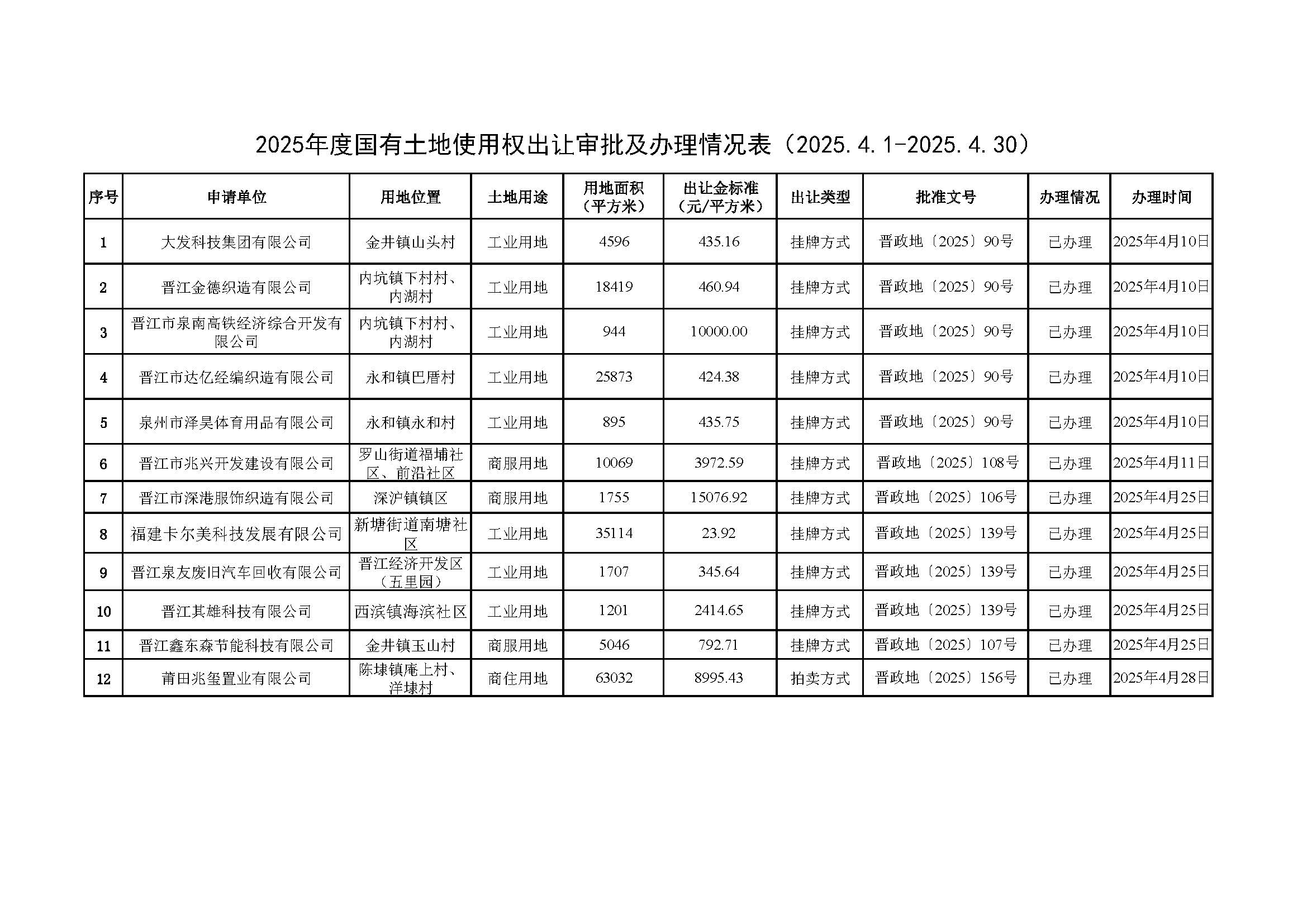 2025年度国有土地使用权出让审批及办理情况表(2025.4.1-2025.4.30)