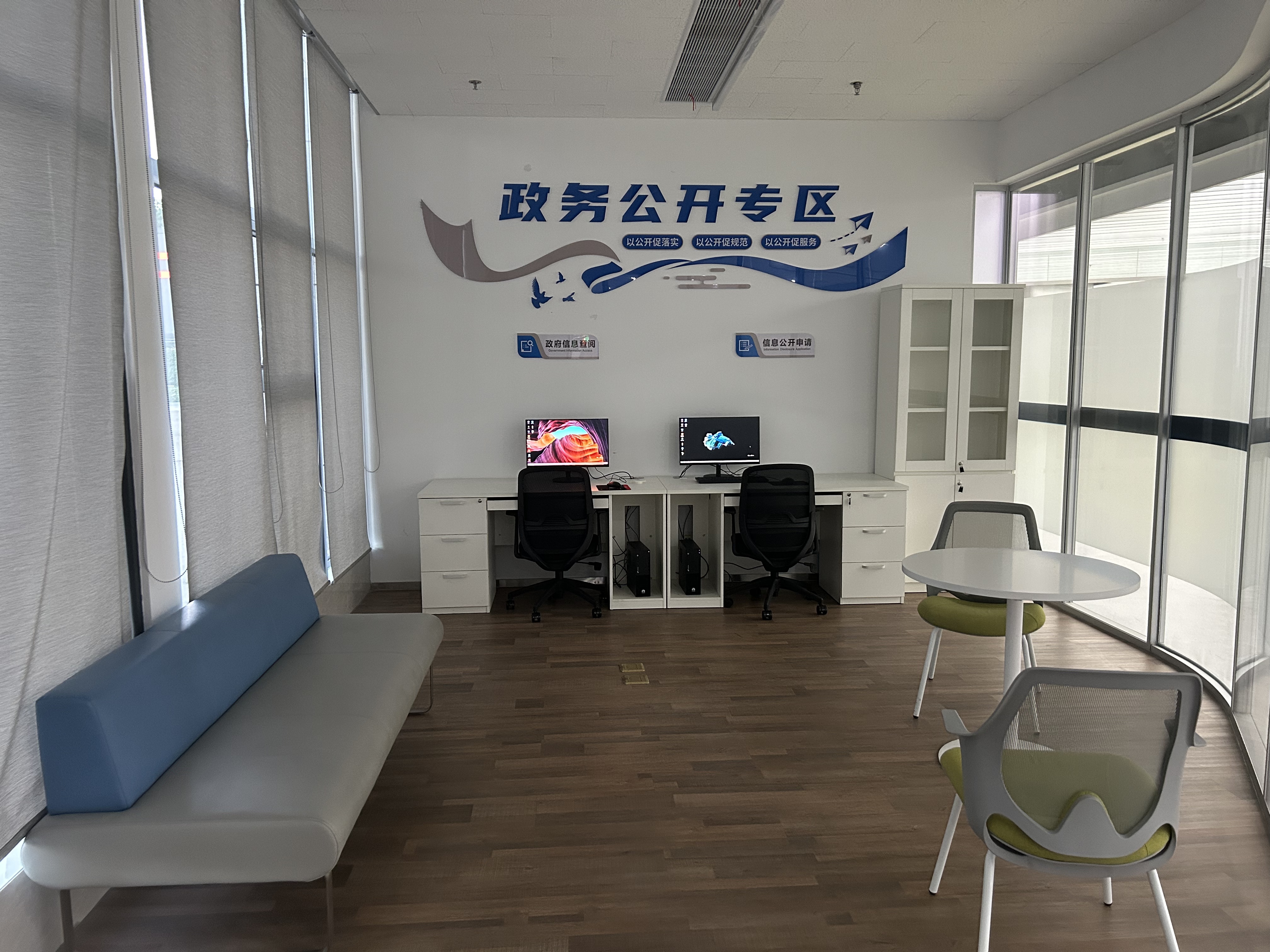 专区内设有政务公开专区指示牌,墙上张贴政府公开信息查询须知、网络申请渠道流程图,2台电脑、办事服务查询一体机等。