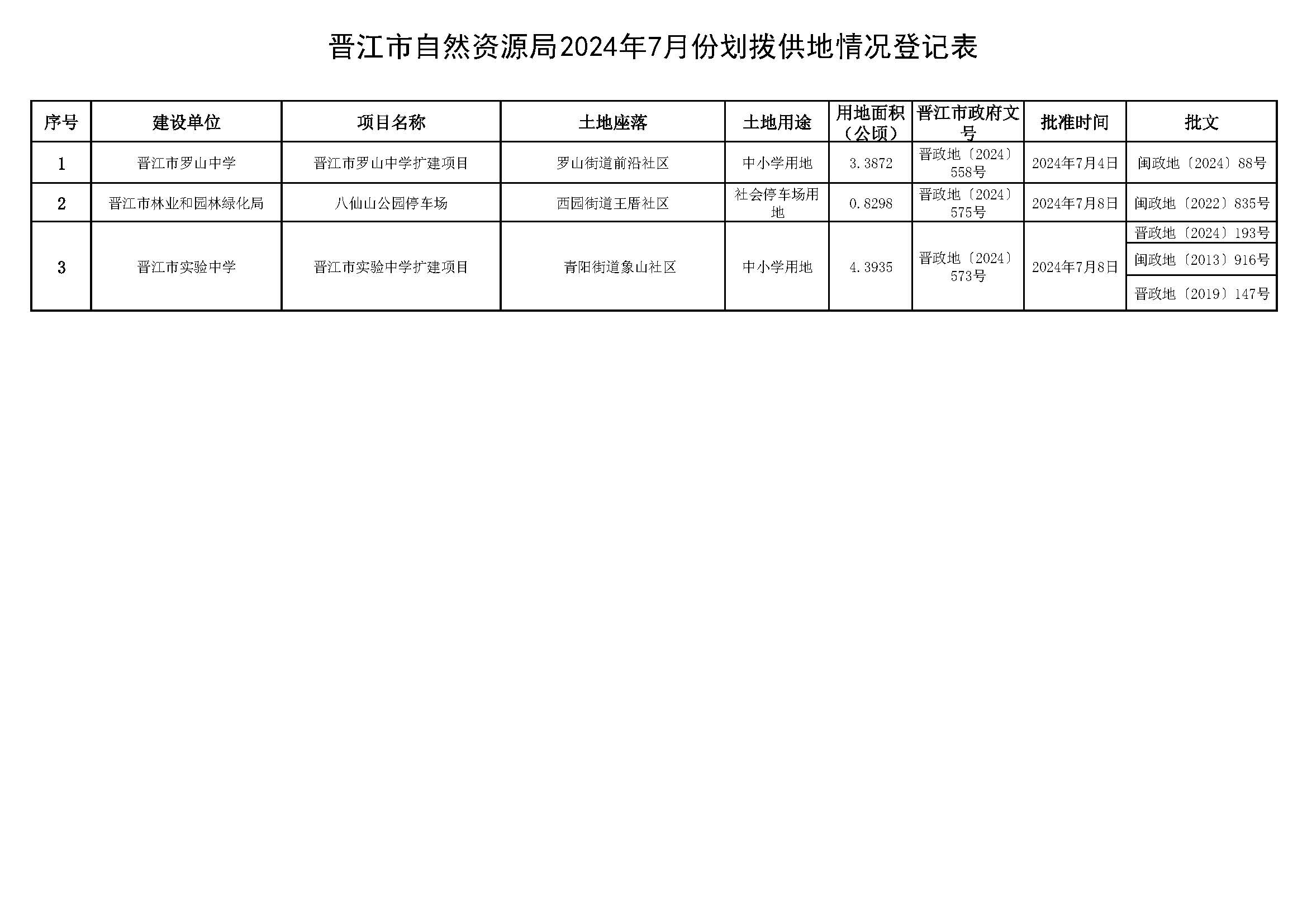 晋江市自然资源局2024年7月份划拨供地情况登记表
