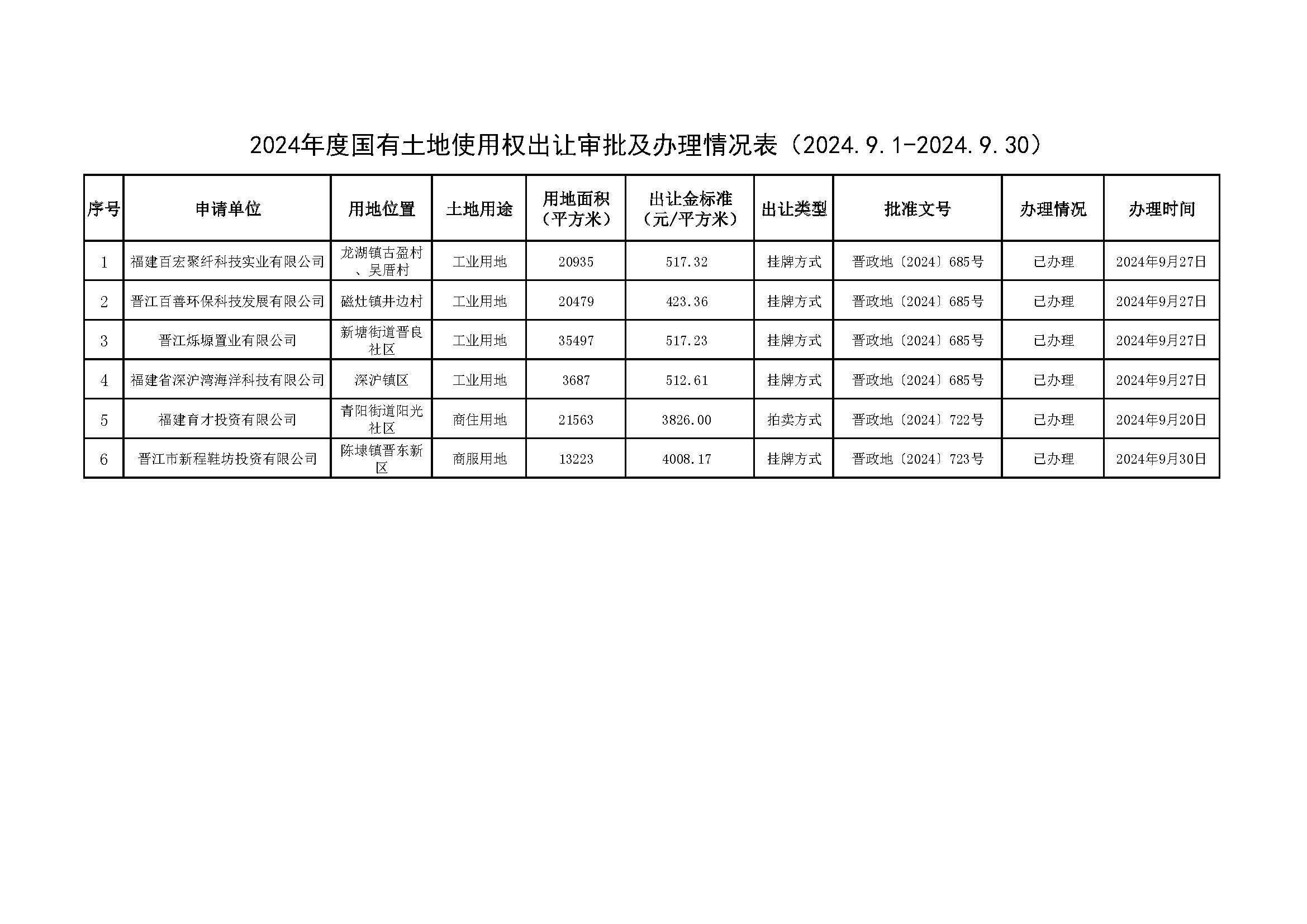 2024年度国有土地使用权出让审批及办理情况表(2024.9.1-2024.9.30)