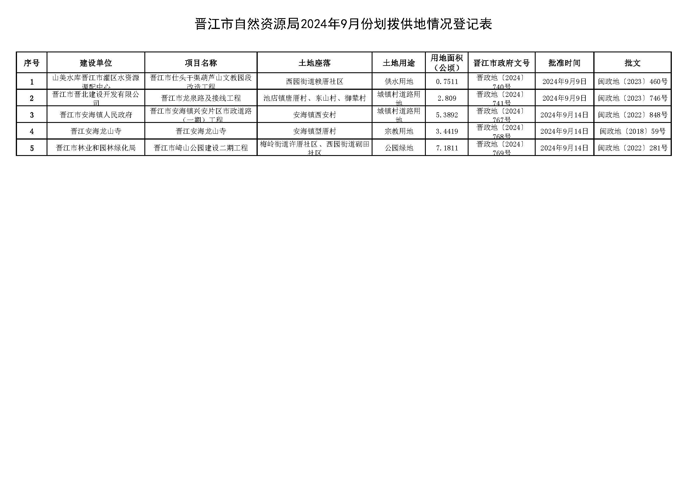 晋江市自然资源局2024年9月份划拨供地情况登记表