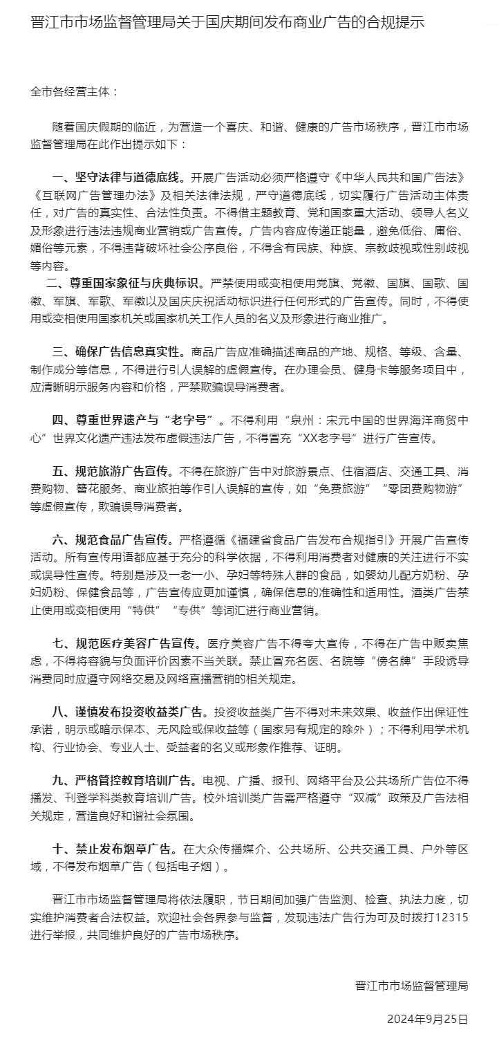 【消费提示】晋江市市场监督管理局关于国庆期间发布商业广告的合规提示