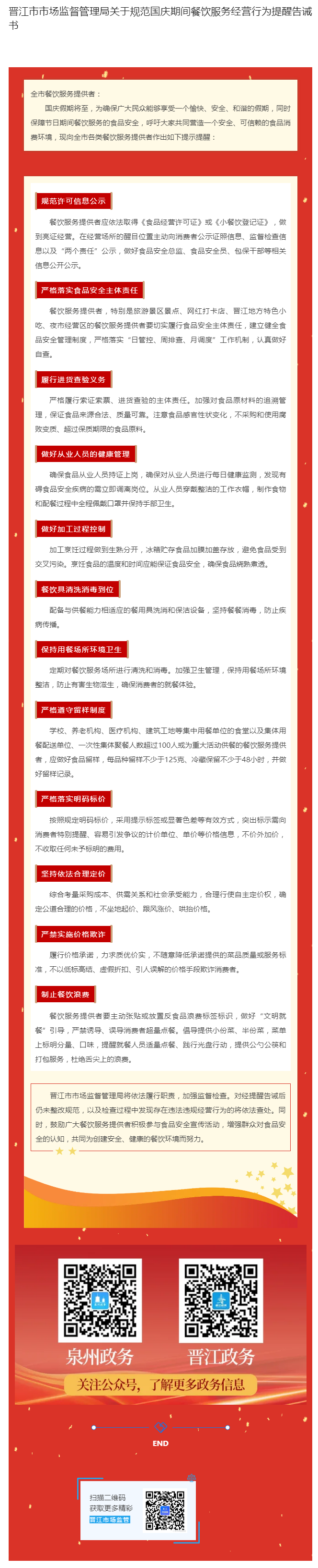 【消费提示】晋江市市场监督管理局关于规范国庆期间餐饮服务经营行为提醒告诫书